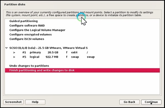 This is an overview of your currently configured partition and mount points. Now click “Finish partitioning and write changes to disk” and click Continue Button to the next step.