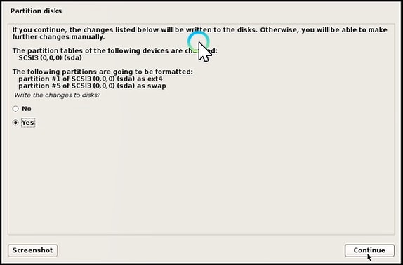 The partition table of the following device is changed. The following partition is going to be formatted. Write the changes to disk? Click “Yes” and hit the continue button.
