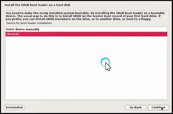 Select device for boot loader installation location. Select /dev/sda and click the Continue button.