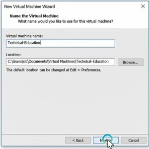 Enter the Name of the virtual machine (Anything you wish), and select the installation path of the virtual machine and click the next button.