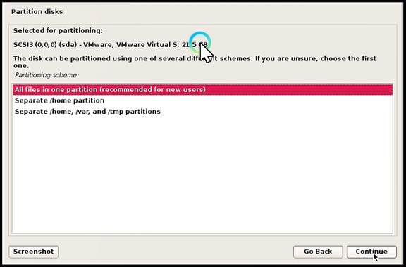 This disk can be partitioned using one of several different schemes. If you are unsure, choose the first one. Select Partitioning scheme: All files in one partition(recommended for new users).