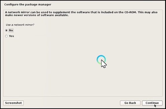 Configure the package manager. Use a network mirror? Click “No” and hit the continue button.