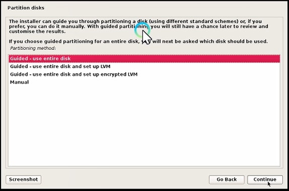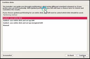 If you choose guided partitioning for an entire disk and will next be asked which disk should be used you will still have a chance later to review and customize to results. Select Guided – use entire disk and click the Continue button.