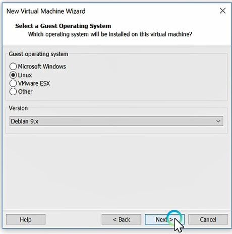 Select a guest operating system. Which operating system will be installed on this virtual machine, Select gets operating system “Linux” and version “Debian 9.x” and click the next button.
