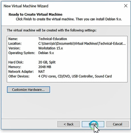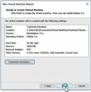 The virtual machine will be created with the following setting, click Finish to create the virtual machine. Then you can install Debian 9.x.