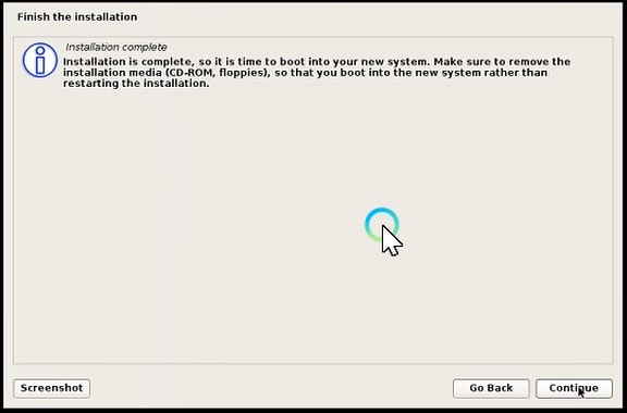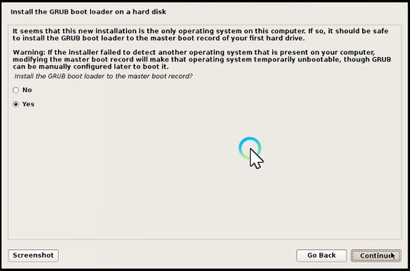 Installation of the GROUB boot loader to the master boot record. Click Yes and Continue.