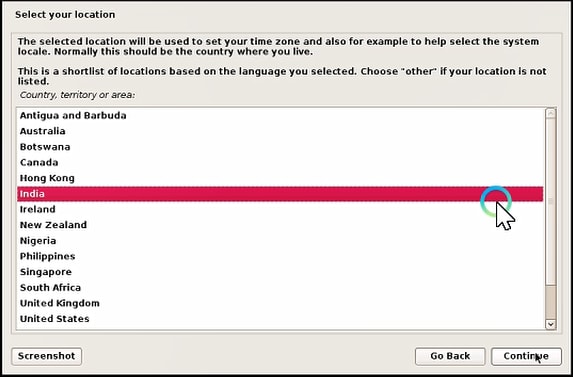 The selected location will be used to set your time zone (According to your location) and also, for example, to help select the system location and time. This is a shortlist of location based on the language you selected choose “other” if your location is not listed. You select your location according to your country, I am from India, so I have selected India.