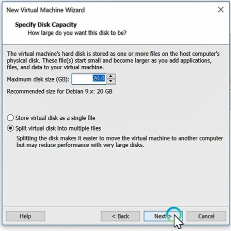 Enter Specify disk capacity, Recommended size for Debian 9.x: 20GB and select store virtual disk as a single file or split virtual disk into multiple files Anything you wish and click next button.