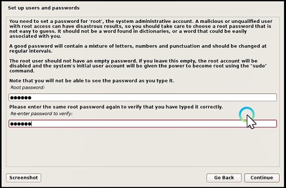 Set up users and passwords, so that your system is safe from any malicious or unqualified access and hit continue button.