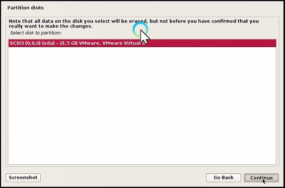 note that all data on this disk you select will be crashed, but not before yours have confirmed that you really want to make the changes. Select disk to partition: 21.5G VMware Virtuals.