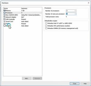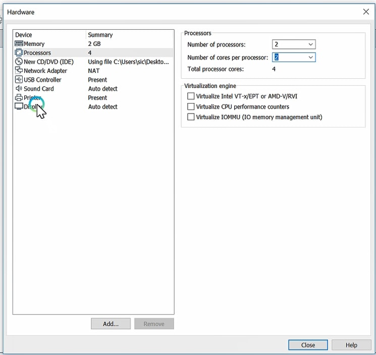 Configure your hardware, select the number of the processor: 2 and the number of cores per processor: 2 and total processor cores: 4. If you want good performance, you should take 4 processors from work to work, and at most, you can see according to your PC.